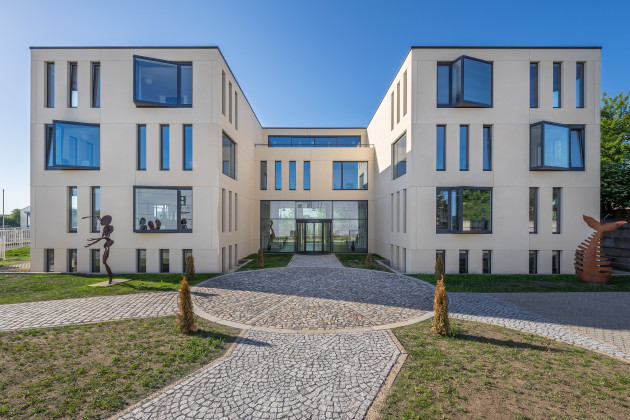 Die Fassade des Gebäudes wurde als gelb eingefärbte Sandwichfassade mit gesäuerten Oberflächen ausgeführt. Die sandgestrahlte Textur verleiht der Betonfassade eine feinkörnige, matte Oberfläche, die modern und langlebig wirkt. Besonderes Highlight war der Einsatz des GFK-Verbundankersystems Thermo Pin®, das die Verbindung der Vorsatzschale mit der Tragschale der Sandwichelemente sicherstellt. Dieses innovative Befestigungssystem garantiert eine thermisch optimierte und stabile Montage der Fassadenelemente.