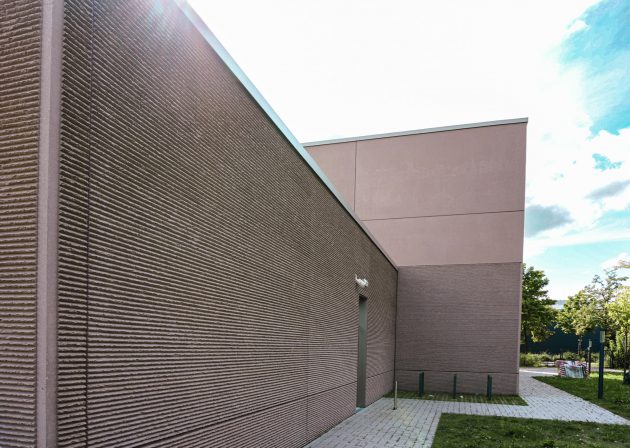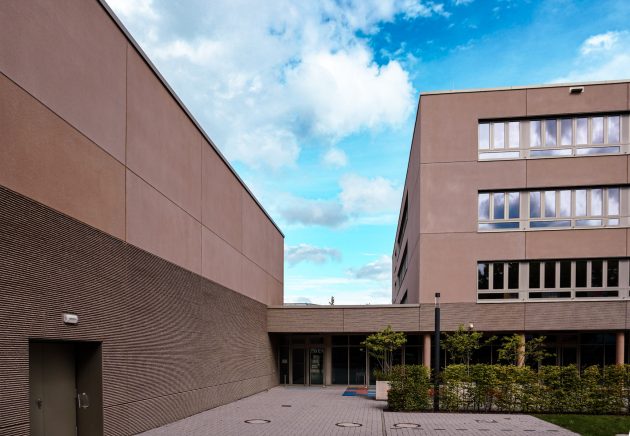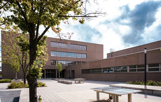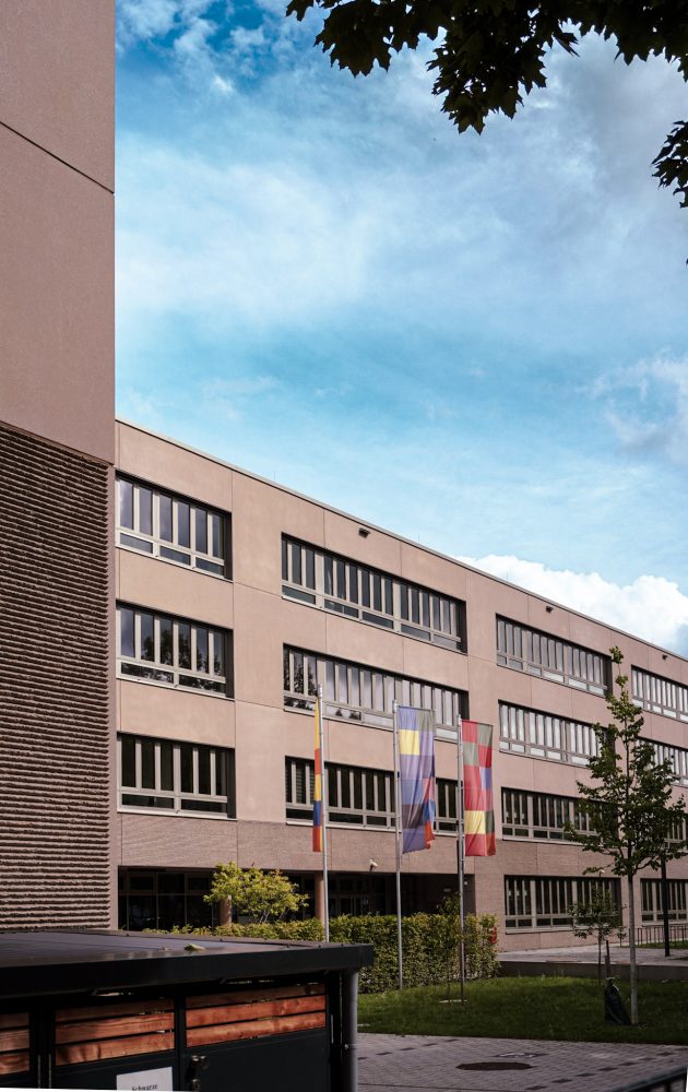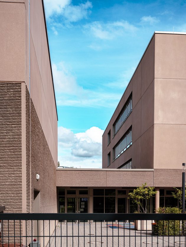 Erreicht wurde die geforderte Kompaktheit, indem Schule und Sporthalle leicht zueinander versetzt wurden, um dann durch eine Schulstraße, die durch beide Gebäude läuft, wieder miteinander verbunden zu werden. Damit erhält das Ensemble gleichzeitig eine klare Gliederung der Außenräume in Schulhof, Sportplatz und Vorplatz – und fügt sich harmonisch in den städtebaulichen Kontext ein. Zusätzlich betont ein umlaufender Sockel den optischen Zusammenhalt der beiden Baukörper.
